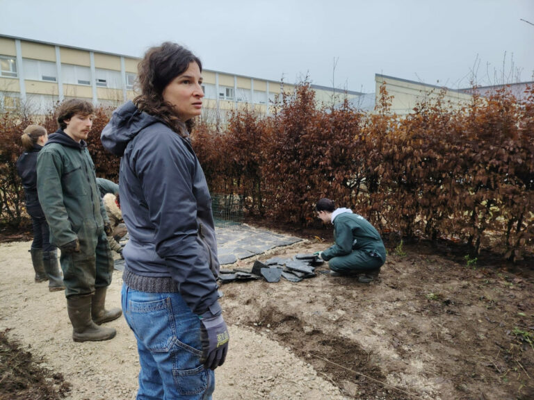 Dans ce contexte, et en lien avec la dynamique culturelle “Nous sommes Orne” en cours dans le bassin-versant, Territoires pionniers et le Campus Terre & Avenir ont engagé un jumelage artistique sur le thème du paysage. Ensemble, ils ont accueilli Camille Fréchou en résidence dans l’établissement à l’automne 2025. Sur l’emplacement d’un ancien jardin de plantes médiévales, la paysagiste, les lycéen·nes et étudiant·es de plusieurs classes ont imaginé et réalisé un jardin en vue de favoriser les continuités écologiques et accueillir la biodiversité dans l’établissement, tout en proposant des espaces de convivialité aux élèves.